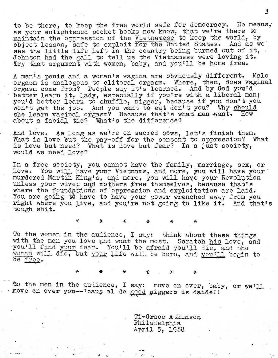 [23] Ti-Grace Atkinson, as quoted in Breanne Fahs, Valerie Solanas: The Defiant Life of the Woman Who Wrote SCUM (and Shot Andy Warhol), New York: Feminist Press, 2014, 312.