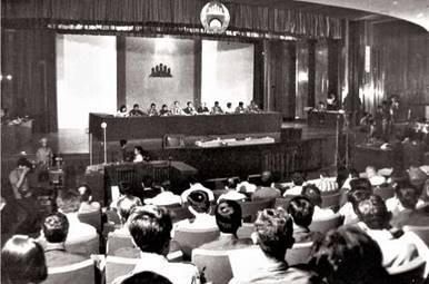 [15] Documentation Center of Cambodia. “The First Congress Meeting of the People’s Representative Assembly,” April 11-13, 1976, catalogue number D21227. The Standing Committee of the People’s Representative Assembly included: Nuon Chea (president), Nguon Kan (first vice president), Peou Suo (second vice president), and Ros Nim, Sar Sean, Mei Chham, Kheng Sok, Matt Ly, Thang Sy, and Ros Preap (members). The members of the State Presidium of Democratic Kampuchea were: Khieu Samphan (president), So Phim (first vice president), and Nhim Ros (second vice president). The members of the Council of Ministers were: Pol Pot (prime minister), Ieng Sary (first deputy prime minister and minister of foreign affairs), Vorn Vet (second deputy prime minister and minister of economy), Son Sen (third deputy prime minister and minister of national defense), Ho Nim (minister of propaganda and information), Thioun Thioeun (minister of health), Ieng Thirith (minister of social affairs), Touch Phoeun (minister of public works), and Yun Yat (minister of culture, education and national studies). In addition, Democratic Kampuchea established some committees such as: the Agricultural Committee led by Chey Suon, Industry Committee chaired by Cheng An, Commerce Committee under Koy Thuon, Rubber Plantation Committee with comrade Phuong as head, Transportation Committee headed by Mei Brang, and the Energy Committee. These six committees were under the supervision of the deputy prime minister in charge of economy, and each committee president had a position equal to minister. However, these institutions never functioned fully.