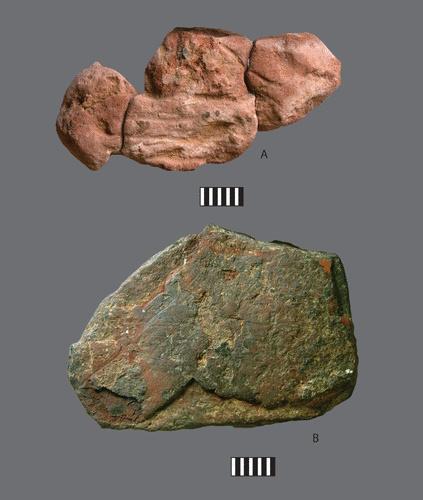 We suspect that the ground piece of weathered iron hydroxide was originally hematite, hydrated to an iron oxide-hydroxide (e.g., goethite) after deposition. It was described as “slightly buttery,” resembling the greasy hematite, but not as dense. One face bears five or six aligned, worn striations (fig. 4D; CA+ supplement fig. S5C), predominantly in a yellow, heavily hydrated zone, but two small residual patches of dark-brown, harder material (comprising the bulk of the piece) emerge through the surface weathering, showing denser, finer striations. Our postdepositional weathering interpretation would suggest that the whole piece originally provided a redder streak.