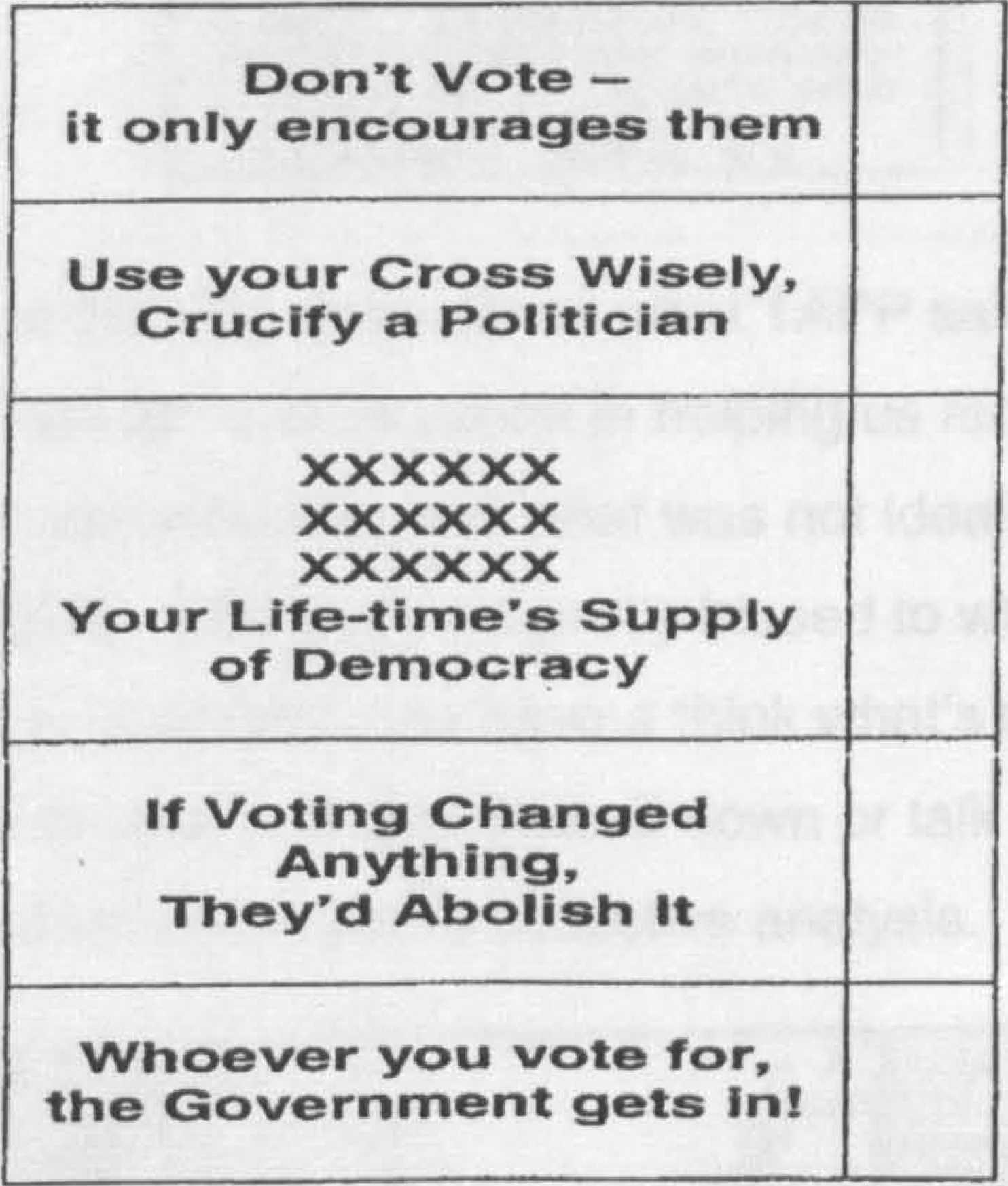 [187] Compare this with RTS: “before it can be recuperated, it disappears - only to spring up again in another place at another time” (‘Maybe’ 2000: 20). TAPPers also referenced the TAZ concept (TAPP 1999: 11).