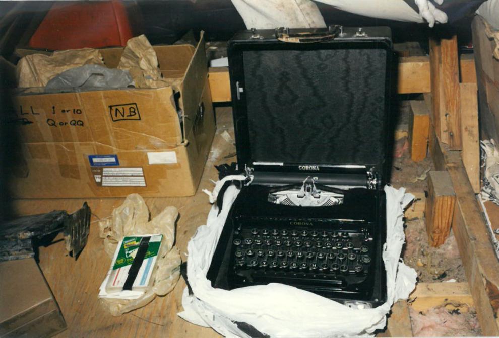 This is the L3 Smith-Corona portable manual typewriter that Kaczynski used to type most of his UNABOM documents, including the "UNABOM Manifesto." This typewriter was seized by the FBI during the search of his cabin in April 1996.