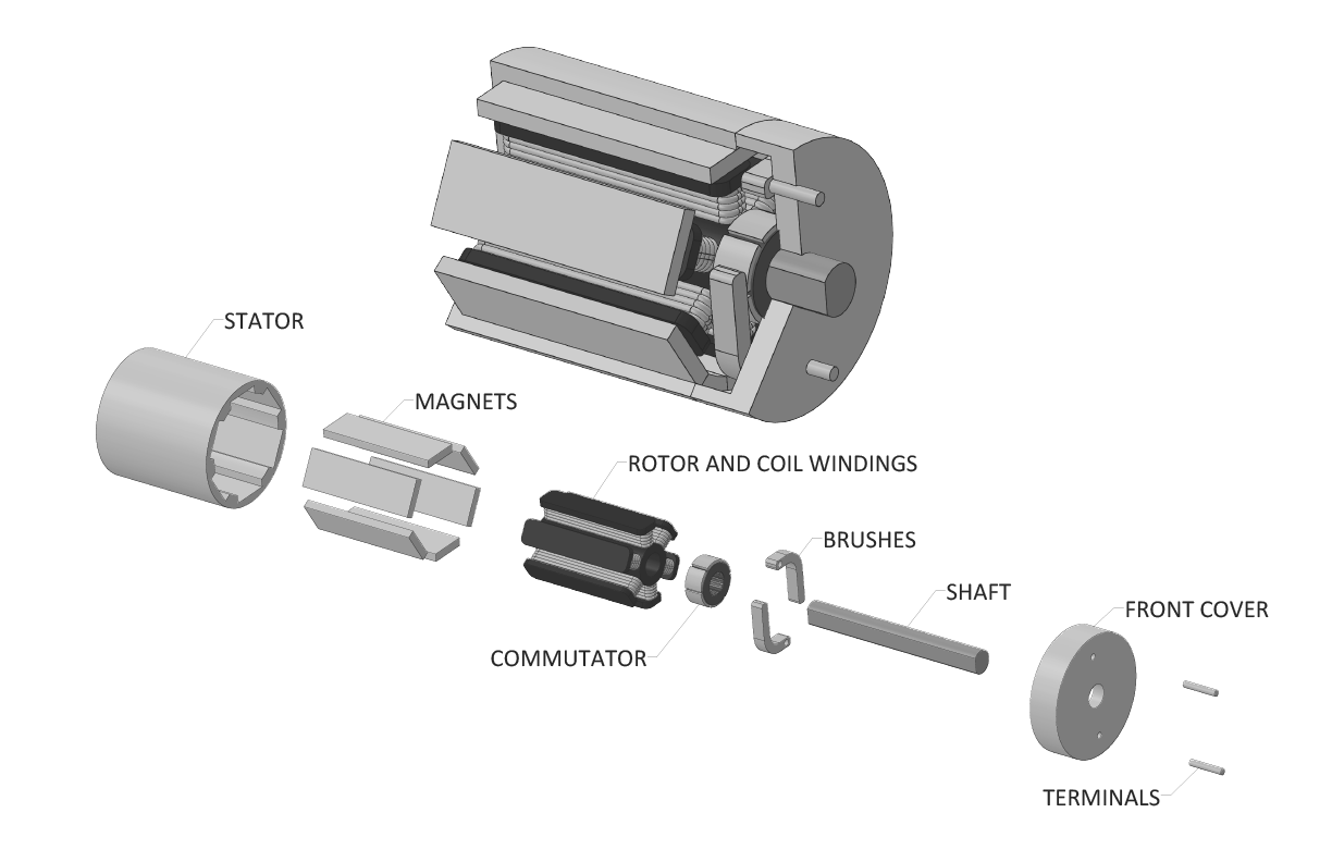 There are many different types of electric motors all suitable for different use cases with various technical tradeoffs. For our purposes we will consider a small brushed DC motor like those currently found in goods such as electric toothbrushes, electric shavers, and smartphones. Such motors have several key pieces: