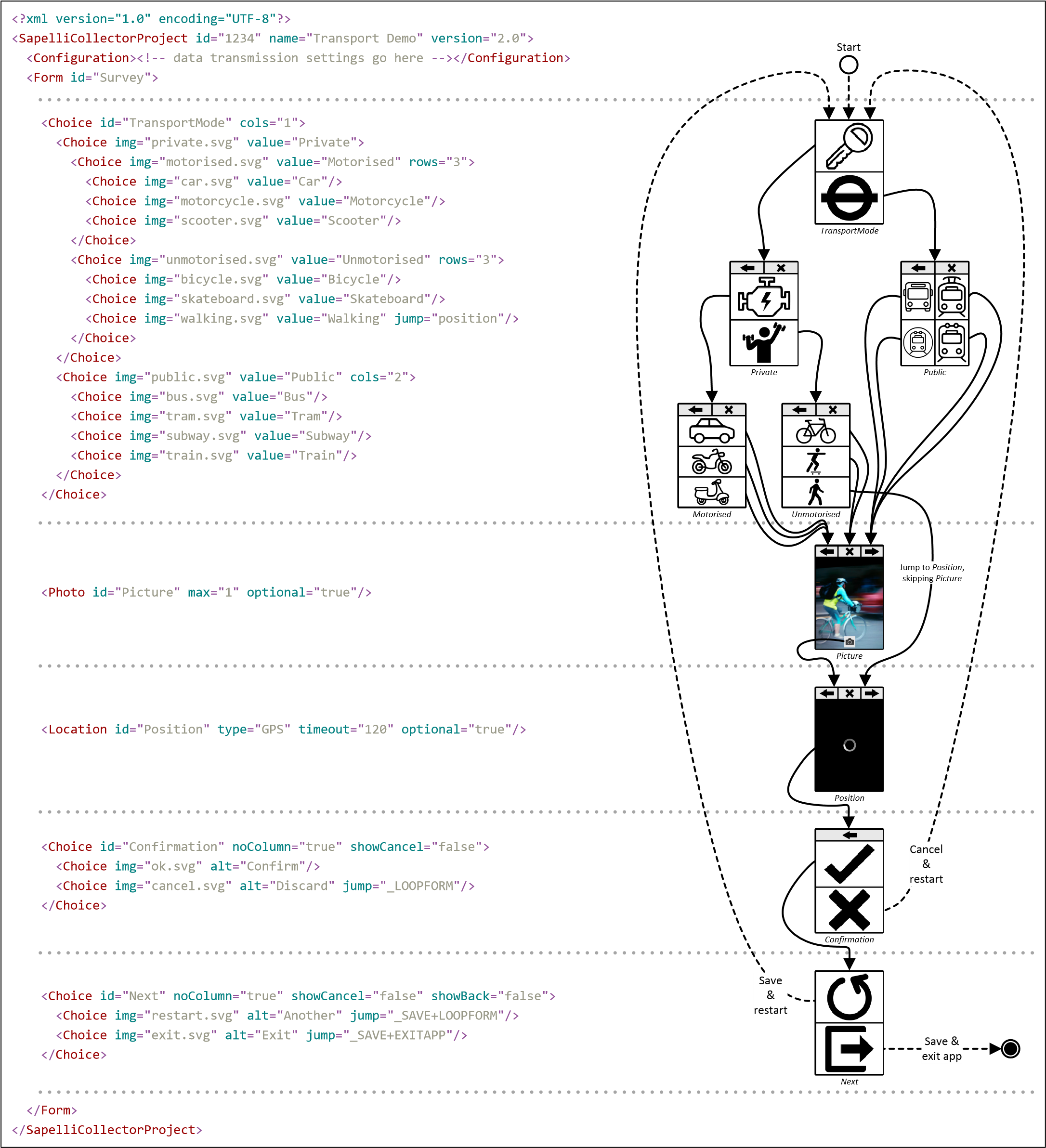 Figure 2 shows an example of how a simple pictorial survey can be described in Sapelli XML and how it would appear in the screen. The description of a form not only defines how it will appear on the screen but also how data entries are stored. Upon parsing the XML a database schema is inferred in which each form field is mapped onto a column.