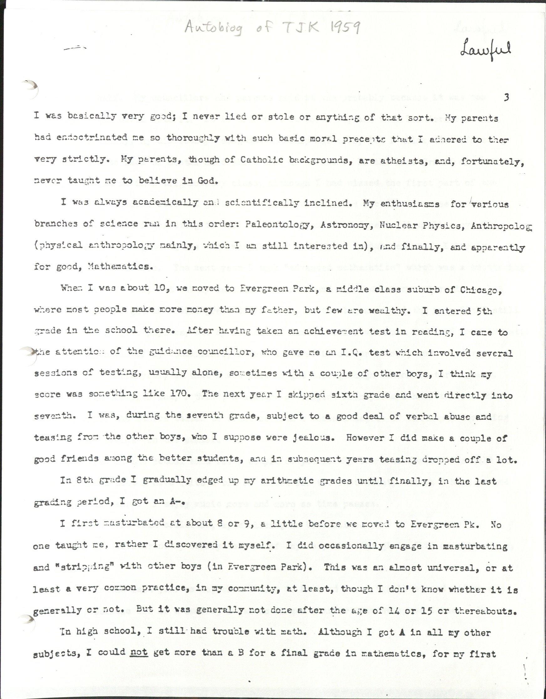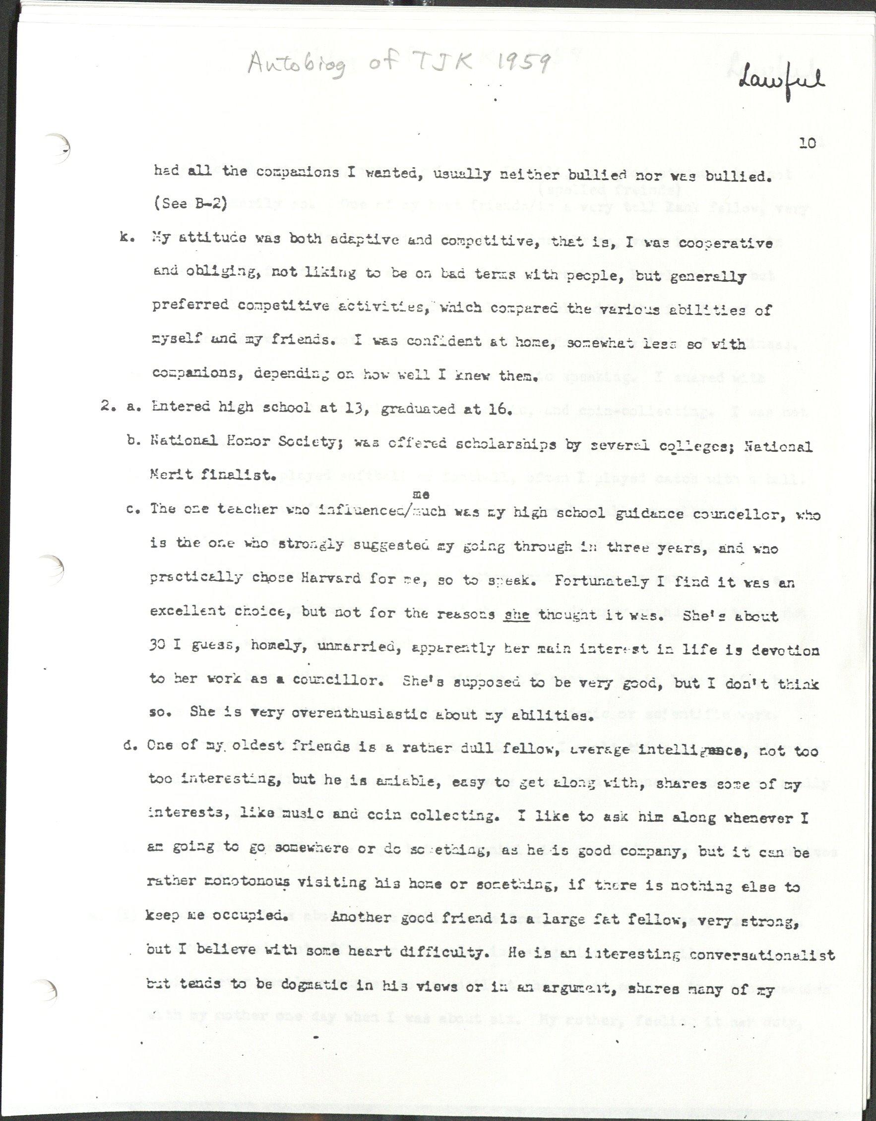 Autobiog of TJK 1959. This is a brief autobiographical sketch that I wrote, probably in the fall of 1959, for Professor Henry A. Murray as part of a psychological study in which I participated. Its trustworthiness is impaired by the fact that I resented having been talked into participating in Murray’s study and therefore tried to avoid revealing too much about my inner self. I tended to downplay problems rather than speaking about them frankly; specifically, I understated the problems I had during adolescence with my parents and my school mates.