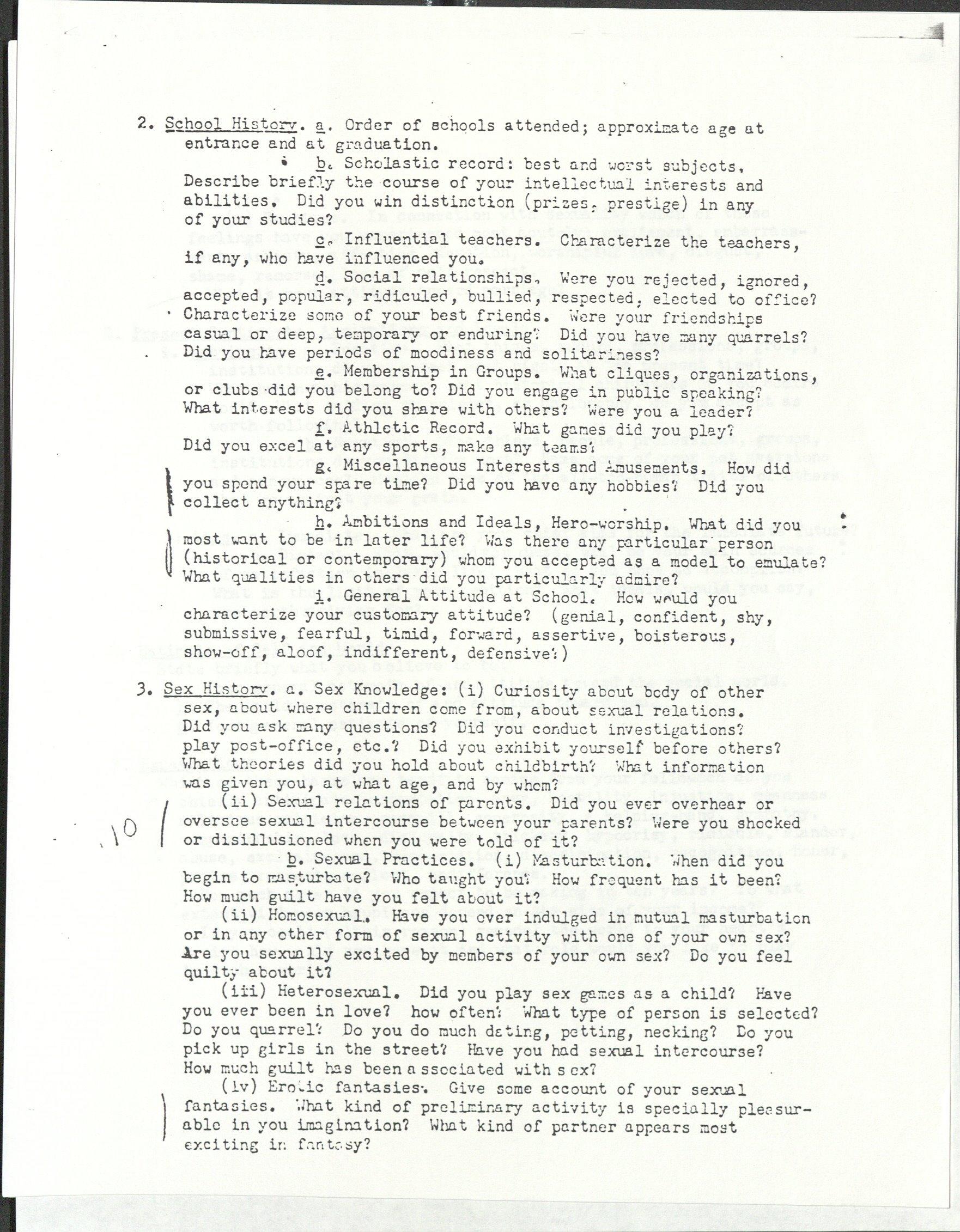 (iii) Heterosexual. Did you play sex games as a child? Have you ever been in love? how often? What type of person is selected? Do you quarrel? Do you do much dating, petting, necking? Do you pick up girls in the street? Have you had sexual intercourse? How much guilt has been associated with sex?