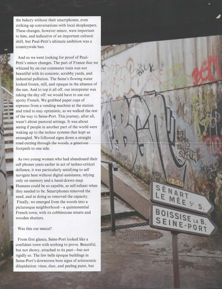 France had a culture that valued historic preservation, technological skepticism, and government intervention, and it was home to the reason we had come here in the first place—Seine-Port, a small suburban city just south Paris with a population of just 2,000, which had made headlines the previous year for its ban on smartphone use in public. If a community could resist an ever expanding techno future, it made sense that it would be French.