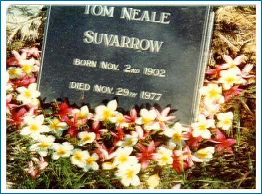 Magazine, because many of us want to get to know Tom Neale, the person, after having read his book. Kenneth Vogel had the opportunity of personally getting to know Tom before he died, and this makes his article all the more valuable. Tom Neale had copyrighted his book in 1966 and he then passed away in 1977. Tom actually made a third stay on Suvarov, and this made his total time about 17 years on the island. During his third visit to Suvarov, Tom was taken off the island by some visiting yachtsmen who found Tom ill with cancer. One of the visitors was a doctor and had removed a cancerous skin tumour from Tom. After being transported back to Rarotonga, Tom was treated with questionable forms of chemo-therapy by a doctor named Milan Brych. During my own visit to Rarotonga in 1983, I learned that Milan Brych had been ostracized from the island due to his medical quackery. He fled to California, USA. There is a special cemetery in Raro known as the “Brych Yard” which holds several of his cancer-treated victims. While in Raro, I visited Tom Neale’s grave, in the Retired Servicemen Association (RSA) Cemetery next to the Brych Yard, and had a photo taken of me sitting by his gravestone. I have learned that Tom Neale has a son, Arthur, and he is currently (Spring of 1999) living on Manihiki atoll (northern Cook Islands). I am trying to contact him so that I might find out more information (and photos?) of Tom Neale and his life. Stella Neale, Tom Neale’s daughter, has shared many photos on my website, www.pacificislandsinfo.com (ed: this link is broken).